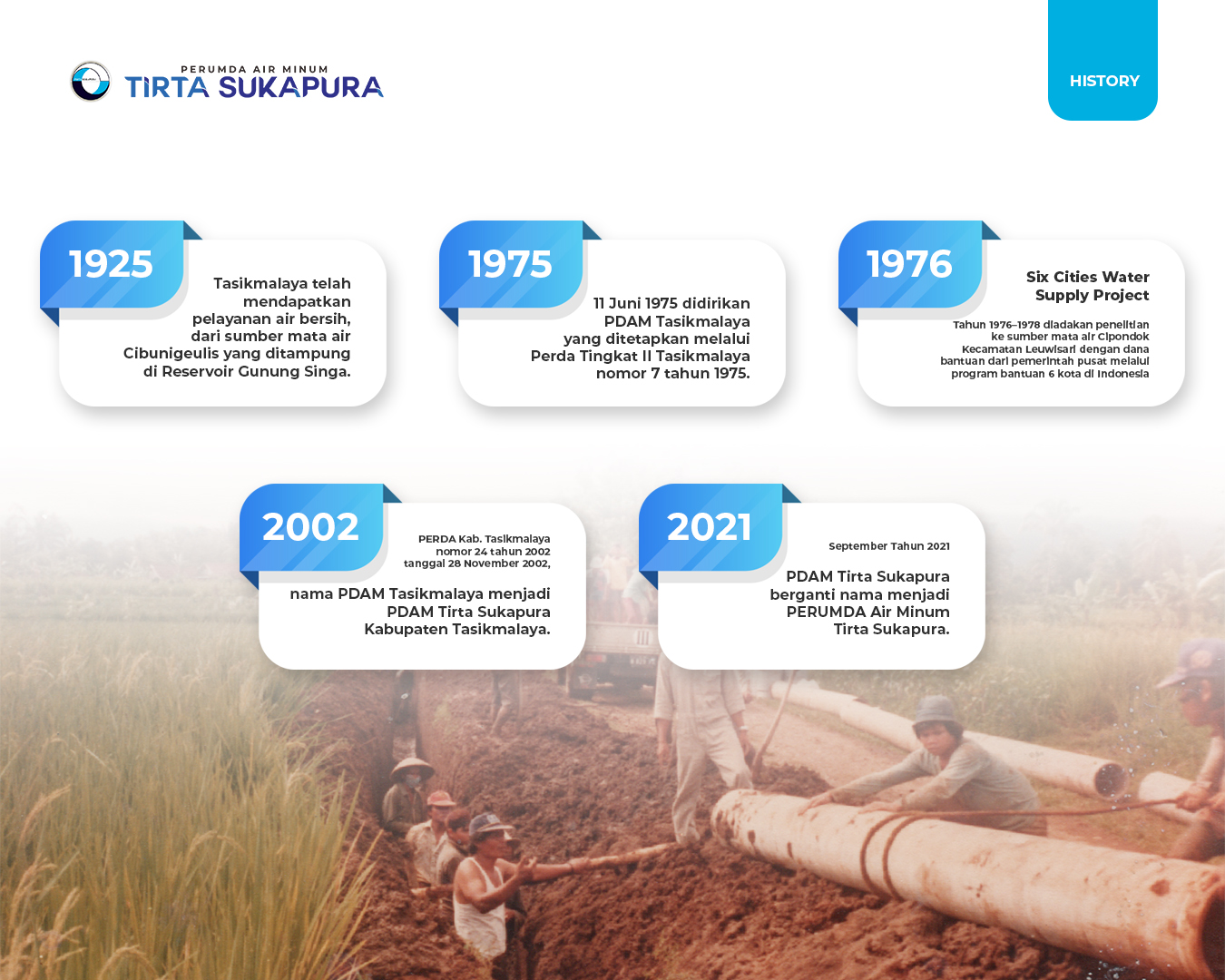Sejak tahun 1925 wilayah Tasikmalaya telah mendapatkan pelayanan air bersih, dari sumber mata air Cibunigeulis dengan debit air + 20 liter/detik ditampung di Reservoir Gunung Singa yang berkapasitas + 400 M3 dengan jumlah konsumen awal 80 sambungan langganan. Kemudian tanggal 11 Juni 1975 didirikan PDAM Tasikmalaya yang ditetapkan melalui Perda Tingkat II Tasikmalaya nomor 7 tahun 1975. Tahun 1976–1978 diadakan penelitian ke sumber mata air Cipondok Kecamatan Leuwisari yang debit potensial airnya +500 l/dtk dengan dana bantuan dari pemerintah pusat melalui program bantuan 6 kota di Indonesia (Six Cities Water Supply Project). Pembangunannya dilaksanakan pada tahun 1978–1982. Pada tanggal 5 April 1982 terjadi musibah meletusnya Gunung Galunggung yang mengakibatkan 2 buah jembatan pipa terbawa banjir lahar, sehingga 3.000 meter pipa transmisi tidak berfungsi. Pada tahun 1984 jalur pipa transmisi Cipondok Kampung Peuteuy Jaya + 2.341 meter yang rusak akibat bencana tersebut direhabilitasi kembali dan aliran air kembali normal. Berdasarkan Peraturan Daerah Kabupaten Tasikmalaya nomor 24 tahun 2002 tanggal 28 November 2002, tentang perubahan kedua kali Perda Kab. DT II Tasikmalaya nomor 7 tahun 1975 tentang pendirian PDAM Kab. Tasikmalaya pasal 4, nama PDAM Tasikmalaya menjadi PDAM Tirta Sukapura Kabupaten Tasikmalaya. Pada bulan September tahun 2021 PDAM Tirta Sukapura berganti nama menjadi PERUMDA Air Minum Tirta Sukapura. Saat ini PERUMDA Air Minum Tirta Sukapura Kabupaten Tasikmalaya telah mampu melayani sambungan langganan sebanyak 46.063 (per bulan Januari 2022). |